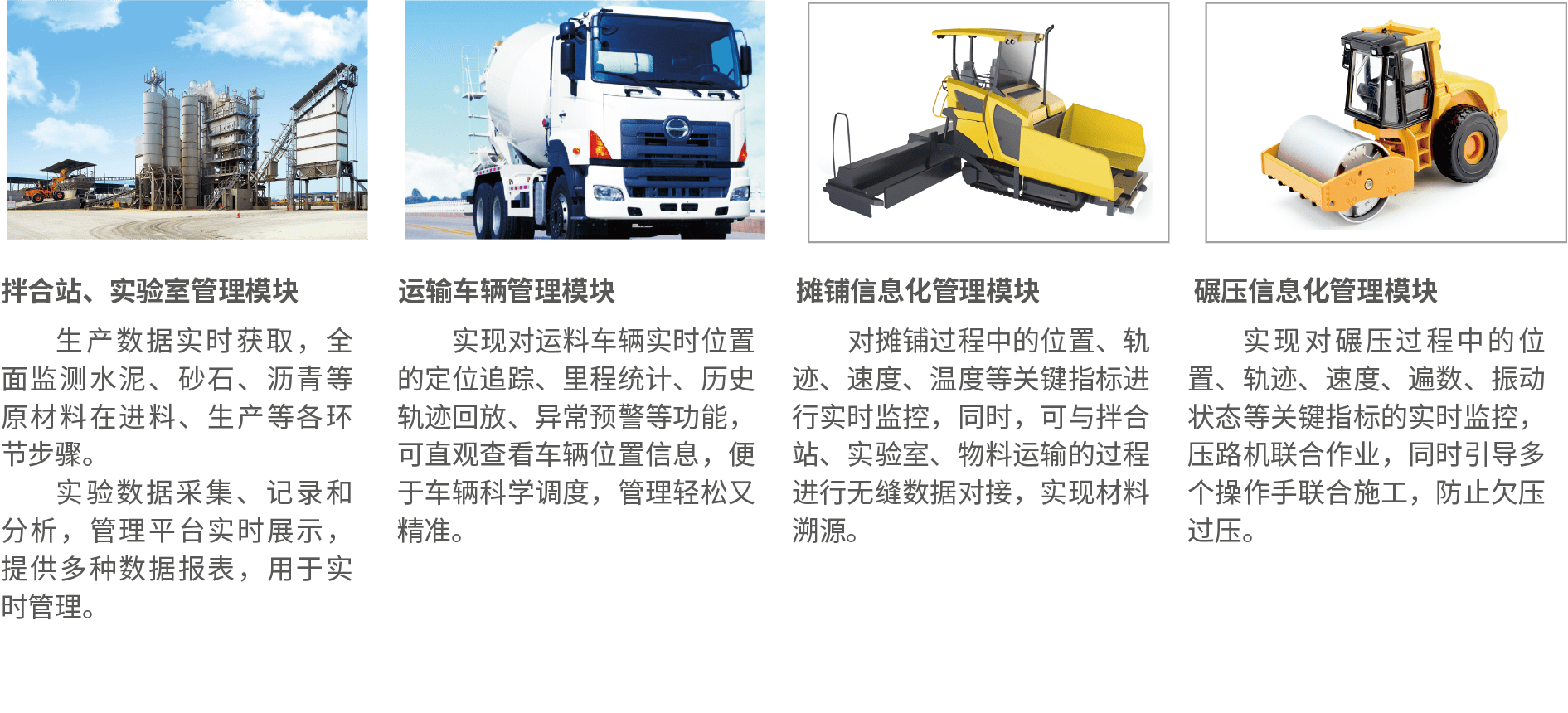 • 加強質(zhì)量控制:對路面施工過程中,混合料的拌合、運輸、攤鋪、碾壓四項工作核心質(zhì)量的信息化監(jiān)控,實行動態(tài)質(zhì)量管理,加強施工過程質(zhì)量控制,確保施工質(zhì)量穩(wěn)定性。