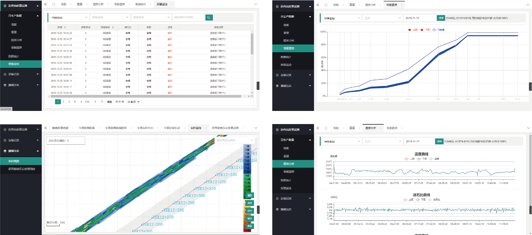 南方路面施工信息化管理系統(tǒng),由拌合站管理模塊、物料運輸管理模塊、路面攤鋪管理模塊、路面碾壓管理模塊及路面施工云平臺五個部分組成,可實現(xiàn)對路面施工中瀝青、水穩(wěn)等混合料的拌合、運輸、攤鋪、碾壓過程的實時動態(tài)監(jiān)控。