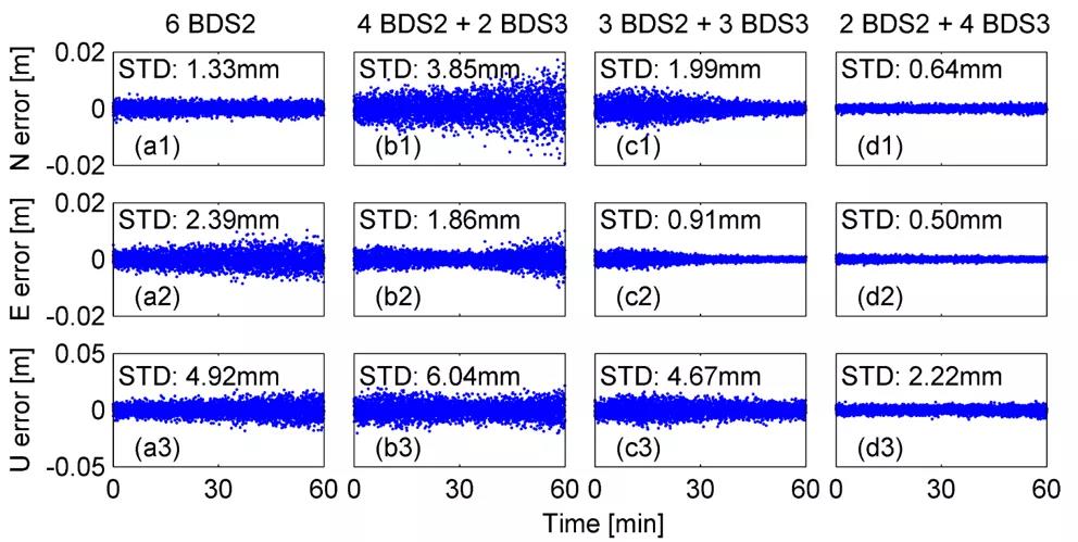 北斗三號(hào)不僅衛(wèi)星更多,它還新增了B1C、B2a和B2b這三個(gè)新頻點(diǎn)。如下圖所示,從左到右,衛(wèi)星總數(shù)量都是6顆,北斗二號(hào)衛(wèi)星數(shù)量在減少,而北斗三號(hào)衛(wèi)星數(shù)量在增加。圖上藍(lán)色線表示零基線RTK定位誤差。明顯看出,最右邊北斗三號(hào)衛(wèi)星的觀測(cè)值定位誤差更小。這驗(yàn)證了,北斗三號(hào)的信號(hào)定位精度更高。